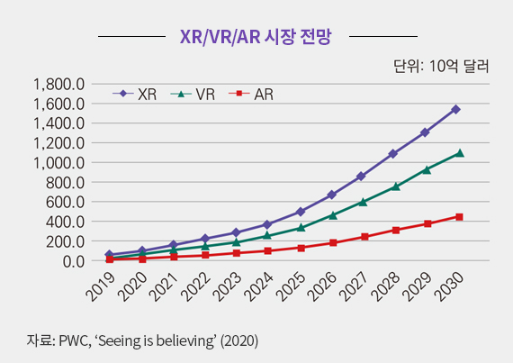 현재 메타버스 시장의 규모를 전망할 때 많은 연구기관들이 AR 또는 VR 시장 규모나 이를 총칭하는 확장현실(XR; eXtended Reality) 시장을 언급하고 있다. 메타버스로의 몰입에 가장 큰 영향을 미치는 것이 VR·AR 기기이기도 하고, XR이 메타버스의 기술적 근간을 형성하기 때문이다. 글로벌 컨설팅 기관 PwC는 2020년 ‘Seeing is believing’이라는 보고서를 통해 메타버스 시장이 글로벌 기준 2030년 1.5조 달러에 이르고 GDP의 1.81%를 차지할 것이라고 전망하였다. 특히 AR 시장은 2030년 1조 924억 달러로 VR 시장의 2030년 전망치 4,505억 달러보다 클 것으로 예측하였다. 현재 VR은 이미 오큘러스가 선점했다고 해도 과언이 아니다. 오큘러스의 경우 AR에 비해 구현 난이도가 낮은 VR 시장을 빠르게 공략하여 성능 고도화와 동시에 단말 가격을 계속 낮춰가면서 엔터테인먼트 중심의 니치마켓 형성에 성공하였다. AR 기기의 경우 이제 초기 시장을 형성해가고 있다. 차세대 메타버스 구축에는 현실 세계의 데이터를 수집할 수 있는 AR 단말이 유리하다. 이에 페이스북, MS, 애플, 구글 등 글로벌 테크 기업들이 AR 글라스 개발에 대거 착수하고 있다.