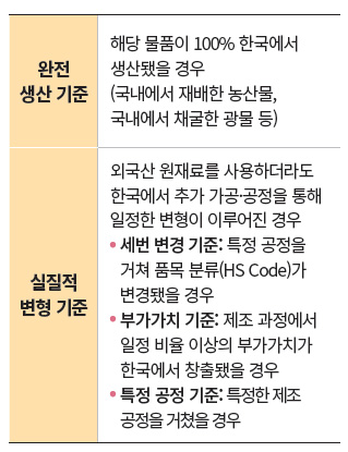 반드시 그렇지는 않다. 국내에서 생산된 물품이라도 FTA 원산지 결정 기준을 충족해야 ‘한국산(원산지: KR)’으로 인정받을 수 있다. FTA에서 원산지를 판정하는 기준은 다음과 같이 크게 두 가지가 있다.