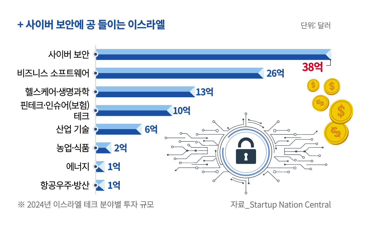 이스라엘은 미국과 함께 세계 사이버 보안 산업을 이끄는 대표적인 국가로 자리매김하고 있다. 2024년 기준, 이스라엘 사이버 보안 기업은 미국 민간 사이버 보안 투자금의 40% 이상을 유치하며 글로벌 투자시장에서 강력한 영향력을 보였다. 세계 10대 사이버 보안 기업 중 7곳이 이스라엘에 연구개발(R&D)센터를 두고 있을 정도로, 이스라엘은 글로벌 기술혁신의 중심지로 평가받는다. 2024년 이스라엘 사이버 보안 기업의 투자 유치액은 38억달러로, 이는 이스라엘 테크 분야 투자 중 36%에 해당한다. 단일 분야로 가장 높은 비중이다.