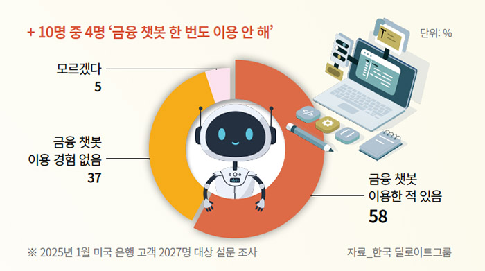 딜로이트는 고객이 금융 챗봇을 이용할 때 느끼는 만족도와 불편한 점, 개선점을 파악하기 위해 2025년 1월 미국 은행 고객 2027명을 대상으로 설문 조사를 실시했다. 설문 조사 결과, 금융 챗봇을 한 번도 이용하지 않은 응답자가 37%에 달했다. 서비스를 향상할 여지가 많다는 의미다. 챗봇 이용자 대부분은 금융 챗봇 경험을 긍정적으로 평가했다. 특히 밀레니얼 세대(1981~96년생)와 Z 세대(1997~2010년생)는 베이비붐 세대나 X 세대(1965~80년생)보다 훨씬 더 긍정적으로 평가해, 챗봇에 대한 세대별 인식 차이가 있음을 나타냈다. 하지만 챗봇에 대한 긍정적 평가는 대부분 단순한 문의 응답 케이스에 국한된 것으로, 고객은 여전히 기본적으로는 인간 상담원과 소통을 더 선호하는 것으로 나타났다.