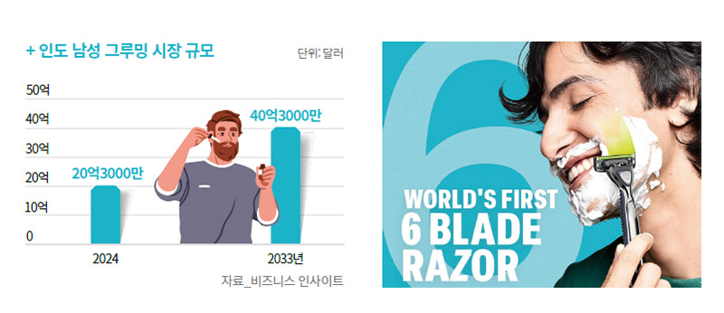 시장조사 기관 포천 비즈니스 인사이트에 따르면, 글로벌 남성용 그루밍 시장 규모는 2023년 584억 6000만달러에서 2032년 855억3000만달러로 확대될 전망이다. 인도 역시 2024년 23억달러에서 2033년 43억달러로, 연평균 성장률 6.8% 증가율을 보일 것으로 예상된다. 수요는 대도시뿐만 아니라, 2·3선 도시로까지 확산하고 있다. 스킨케어, 세럼, 향수 수요가 급증하면서 카테고리 세분화도 가속화됐다.