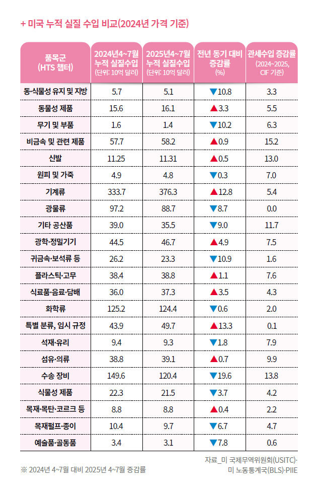 PIIE 분석에 따르면, 이러한 고율 관세 조치와 관련된 정책이 단기적으로는 오히려 수입 확대와 수출 감소를 동시에 불러왔다. 미국 내 수입업자는 2025년 관세 시행 이전에 대규모로 상품을 들여오며 사전 수입이 확대되었고, 그 결과 2025년 상반기 총수입은 전년 대비 크게 증가했다. 특히 기계류, 광학기기, 가공식품 등 해외 의존도가 높은 품목은 2025년 4~7월에도 전년 동기 대비 수입 증가세를 유지했다. 반면, 이 기간 대부분 품목군의 수출은 감소했는데, 이는 관세 부과 이후 중간재·부품 조달 비용이 상승하면서 수출용 생산이 둔화한 영향으로 분석됐다. HTS(미국 통합 관세표)기준 수송 장비(HS 86~89) 수입은 고율 관세 영향을 크게 받으며 다른 품목군과 대비되는 흐름을 보였다. 수송 장비는 ‘무역확장법 제232조’에 따른 고율 관세 영향을 직접적으로 받으며 2025년 4~7월 실질 수입이 전년 대비 19.6% 감소해 전체 품목군 가운데 가장 큰 폭의 하락세를 보였다. 이는 품목별로 관세 민감도가 크게 다르다는 점을 보여준다.