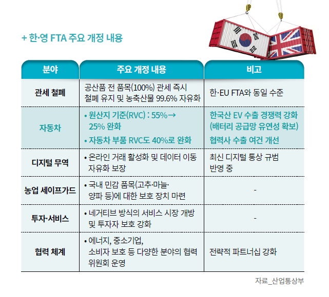 2025년 12월 15일, 한·영 자유무역협정(FTA) 개정 협상이 최종 타결됐다. 브렉시트 이후 한·EU(유럽 연합) FTA를 임시 연장하는 형태로 유지되던 양국 통상 관계가 2년간 협상 끝에 실질적 업그레이드를 이뤄냈다. 자동차 원산지 기준(RVC)이 55%에서 25%로 완화되고, 수리·재반입 관세 면제, 수출입 허가 투명성 강화 등 실무적 성과도 함께 도출됐다.